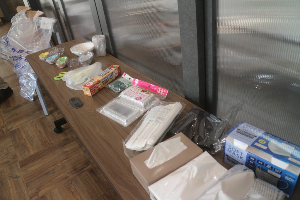買ってきた食材をお弁当箱に詰める作業がはじまりますが、マスクに手袋、消毒液、調理用はさみやキッチンペーパーなど対策してます。