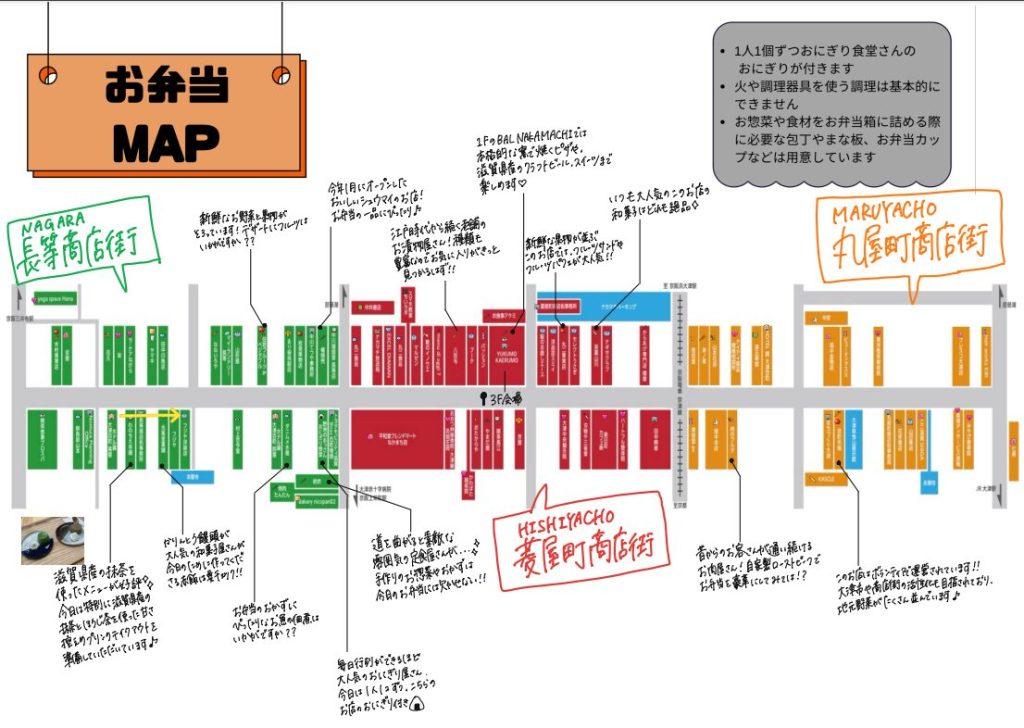 ナカマチ商店街を歩いて、まずはリサーチです。どこにどんなお店があるのか「お弁当マップ」を見ながら、チェックしていきます。